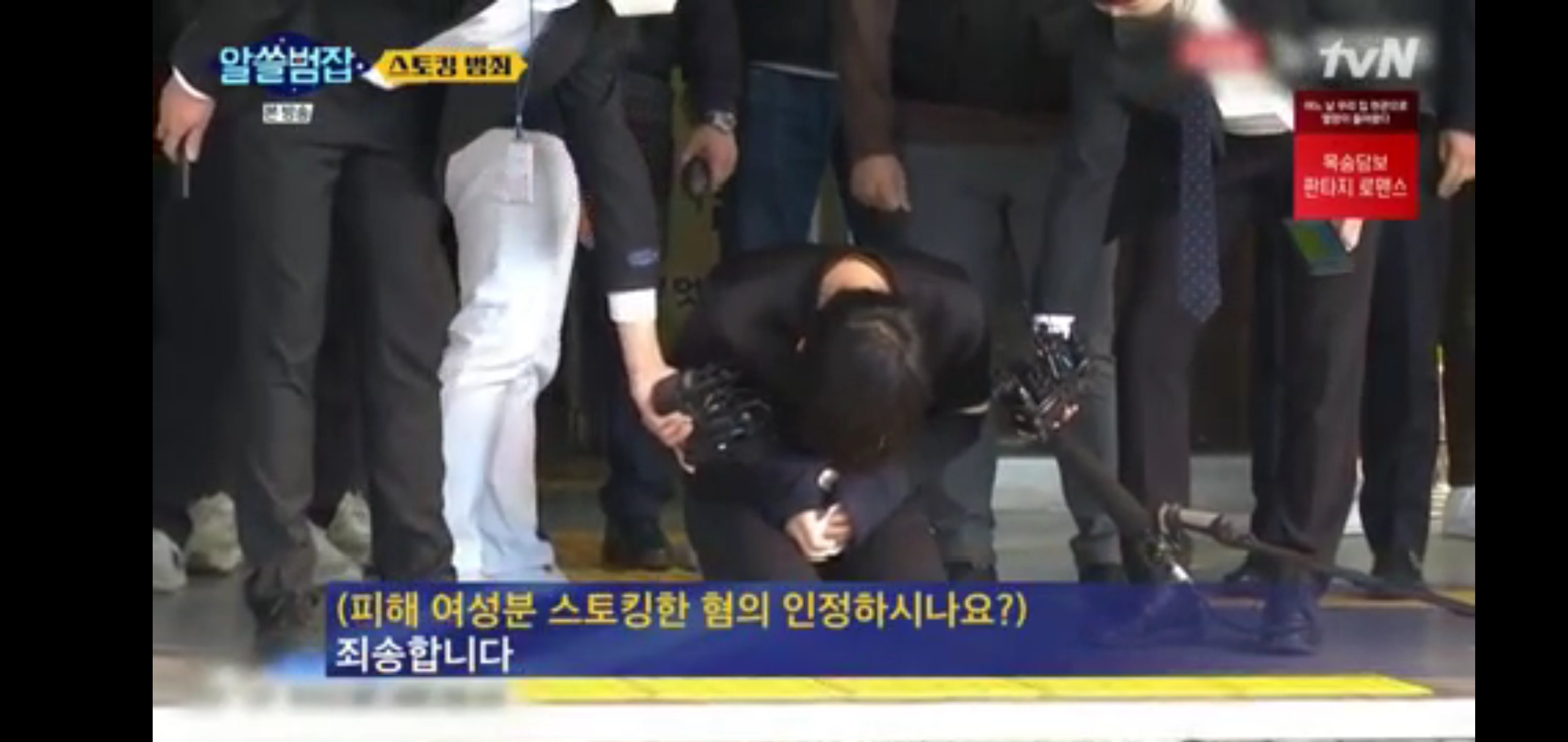김태현은 무릎을 꿇고 기자들이 질문하면 3초동안 고개를 숙이고 "죄송합니다"하고 고개를 천천히 든다.