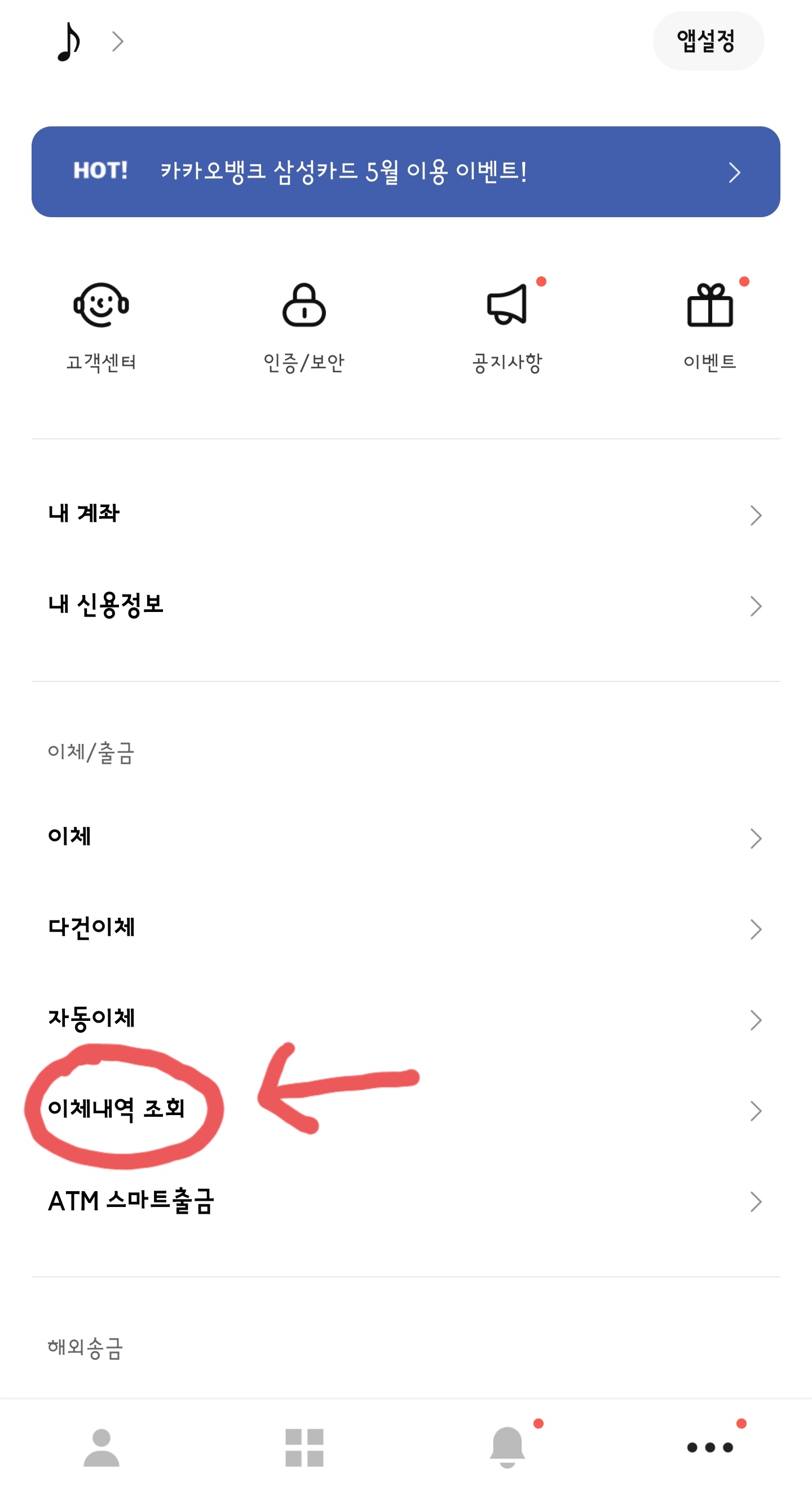 1. 카카오뱅크 로그인 후 하단 우측에 점3개를 누른다.