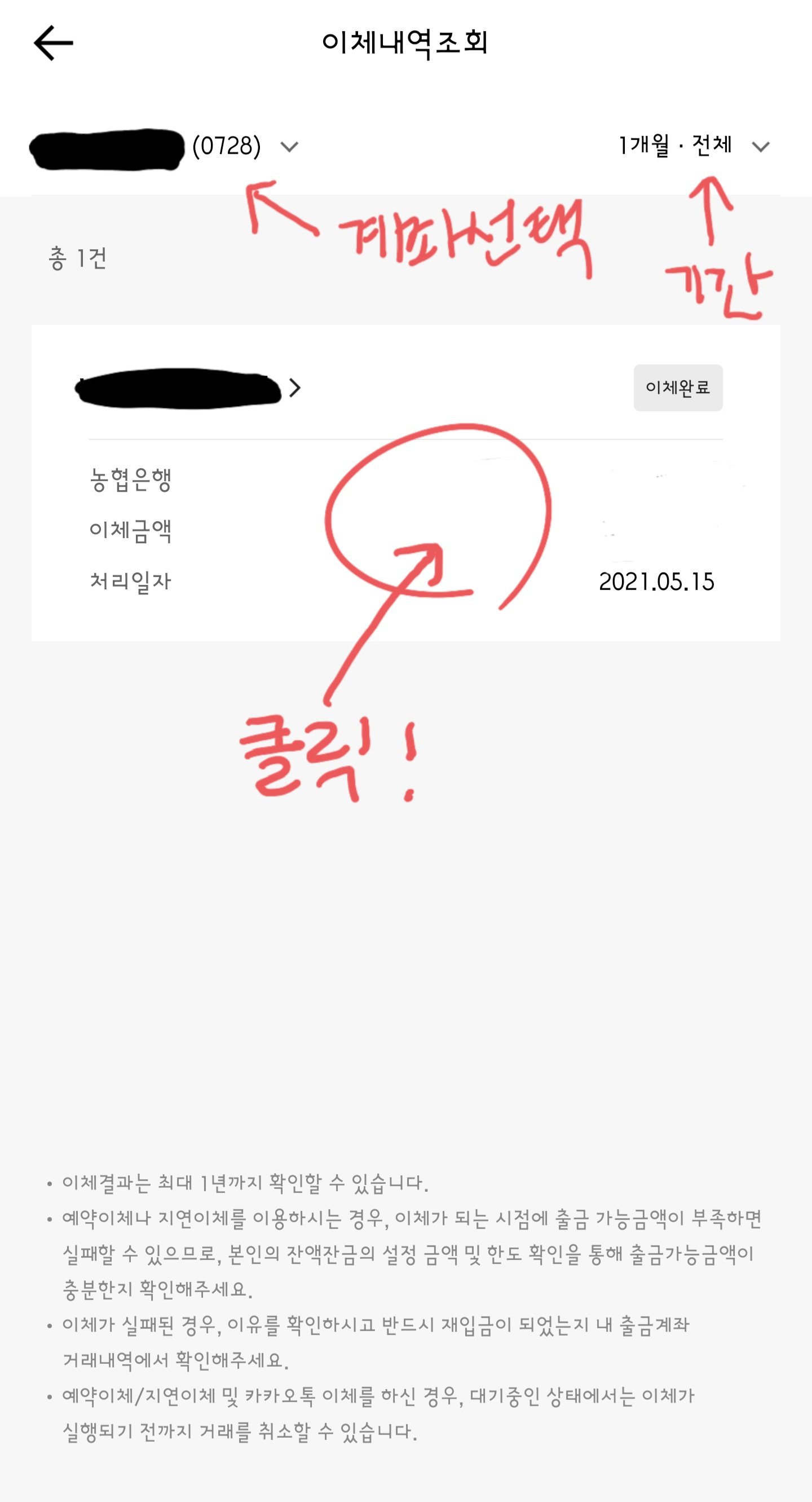 3. 해당 계좌를 선택 > 기간을 설정 > 해당 내역을 누른다.