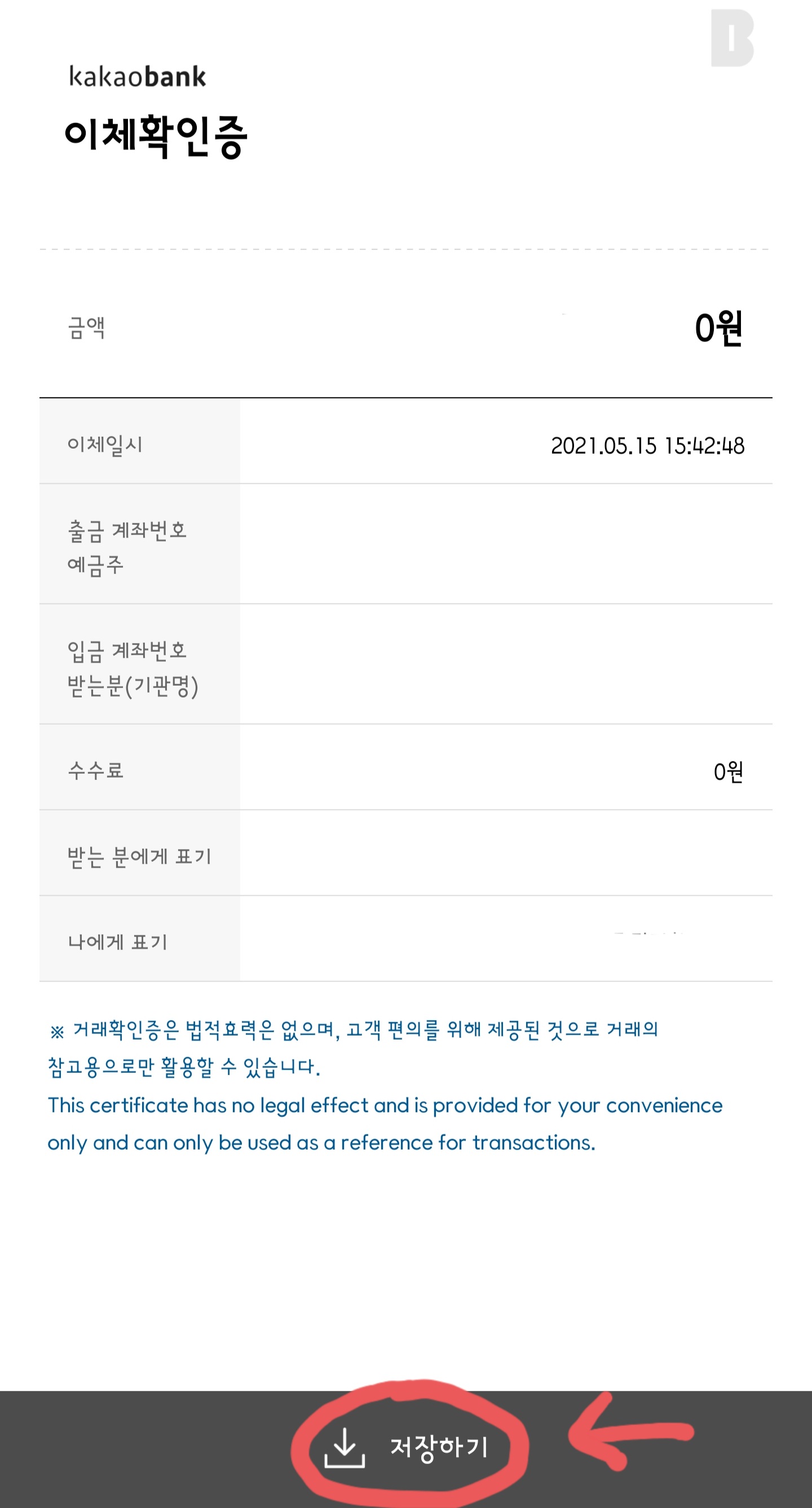 PC프린터기로 출력을 하는 법 말고 모바일 자체에서 이체확인증을 저장하는 방법이 따로 있었다.