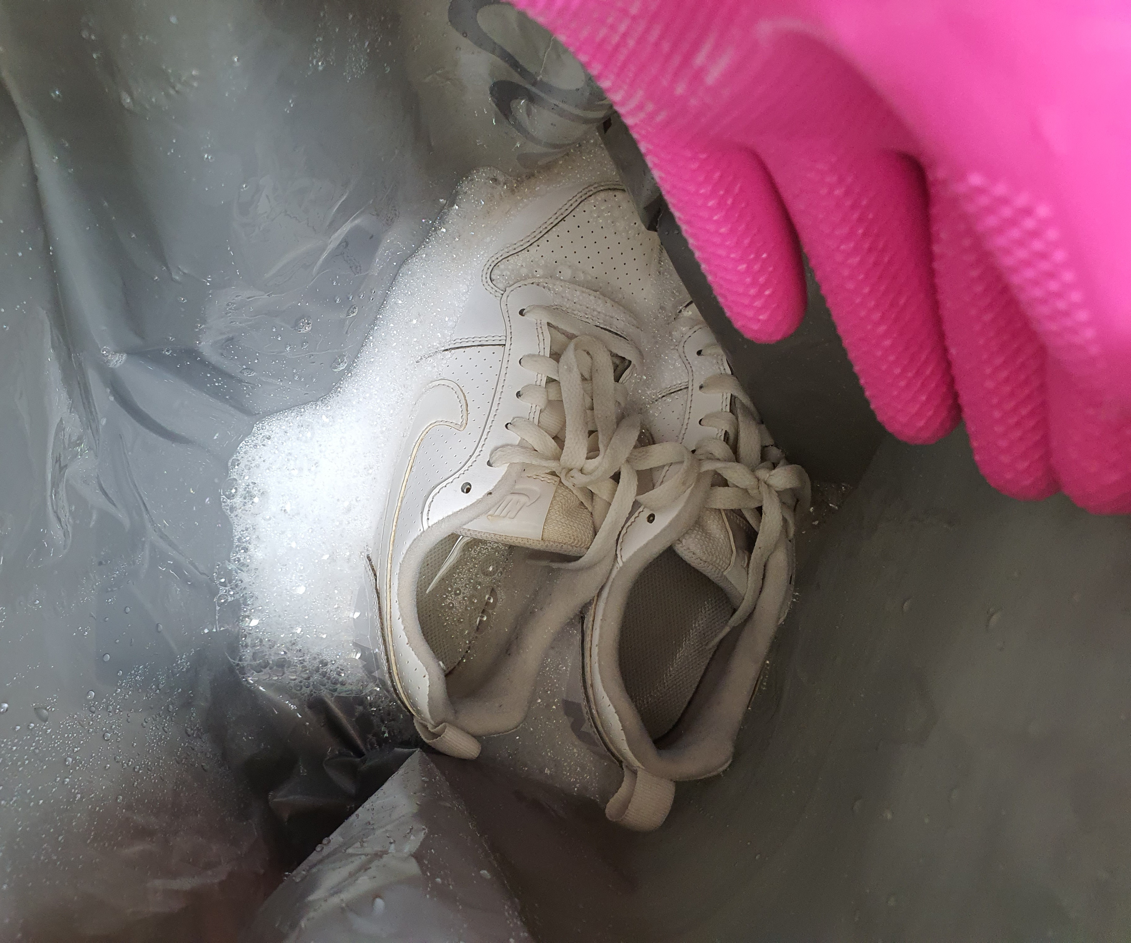 4. 물을 넣고 잘 섞은 후 운동화를 넣는다.