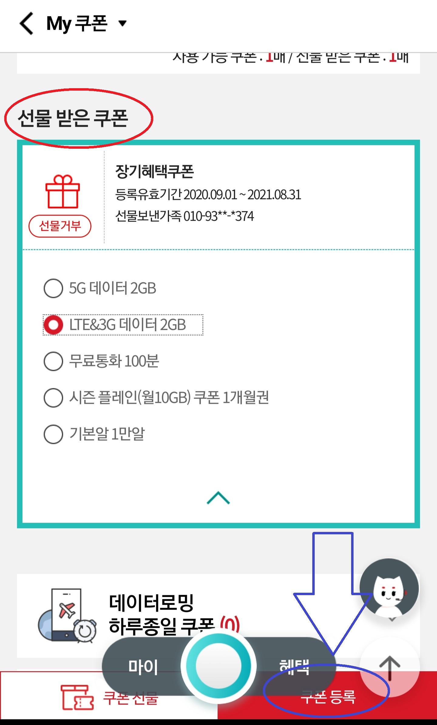 MY쿠폰 > 장기혜택쿠폰 > 선물 받은 쿠폰> 쿠폰등록을 클릭!