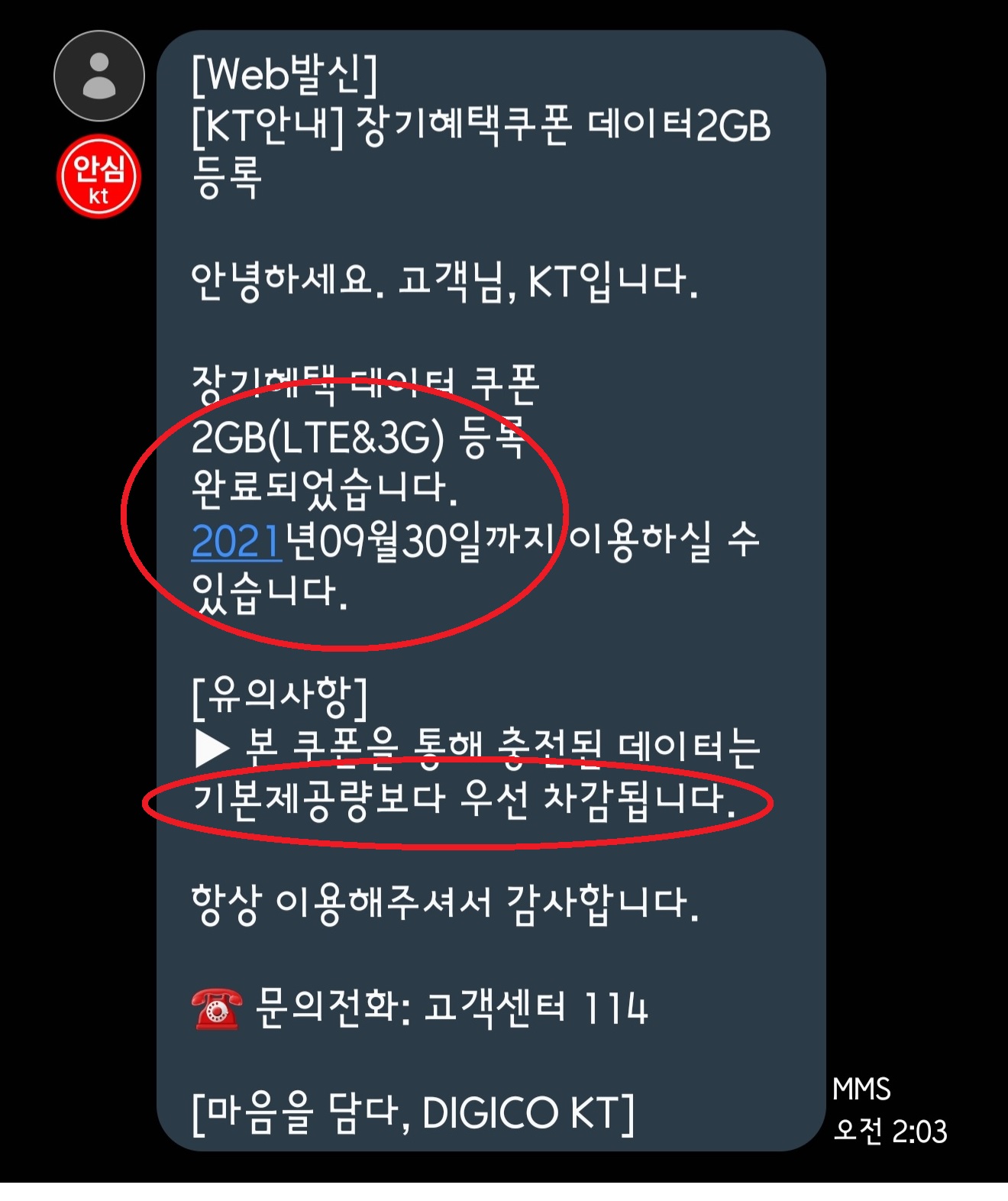 장기혜택쿠폰을 통해 충전 된 데이터는
