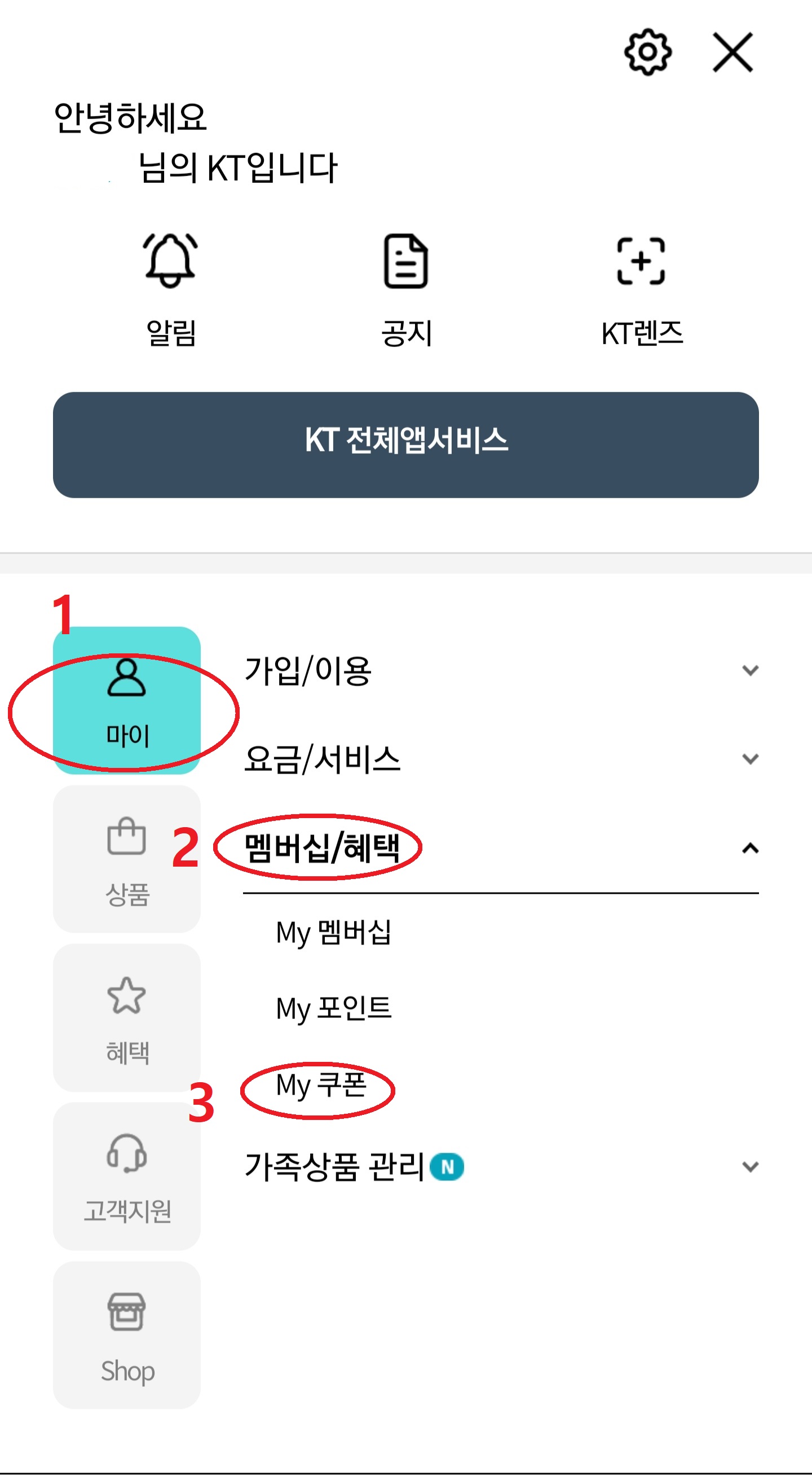 메뉴 > 마이 > 멤버십/혜택> MY 쿠폰 클릭!