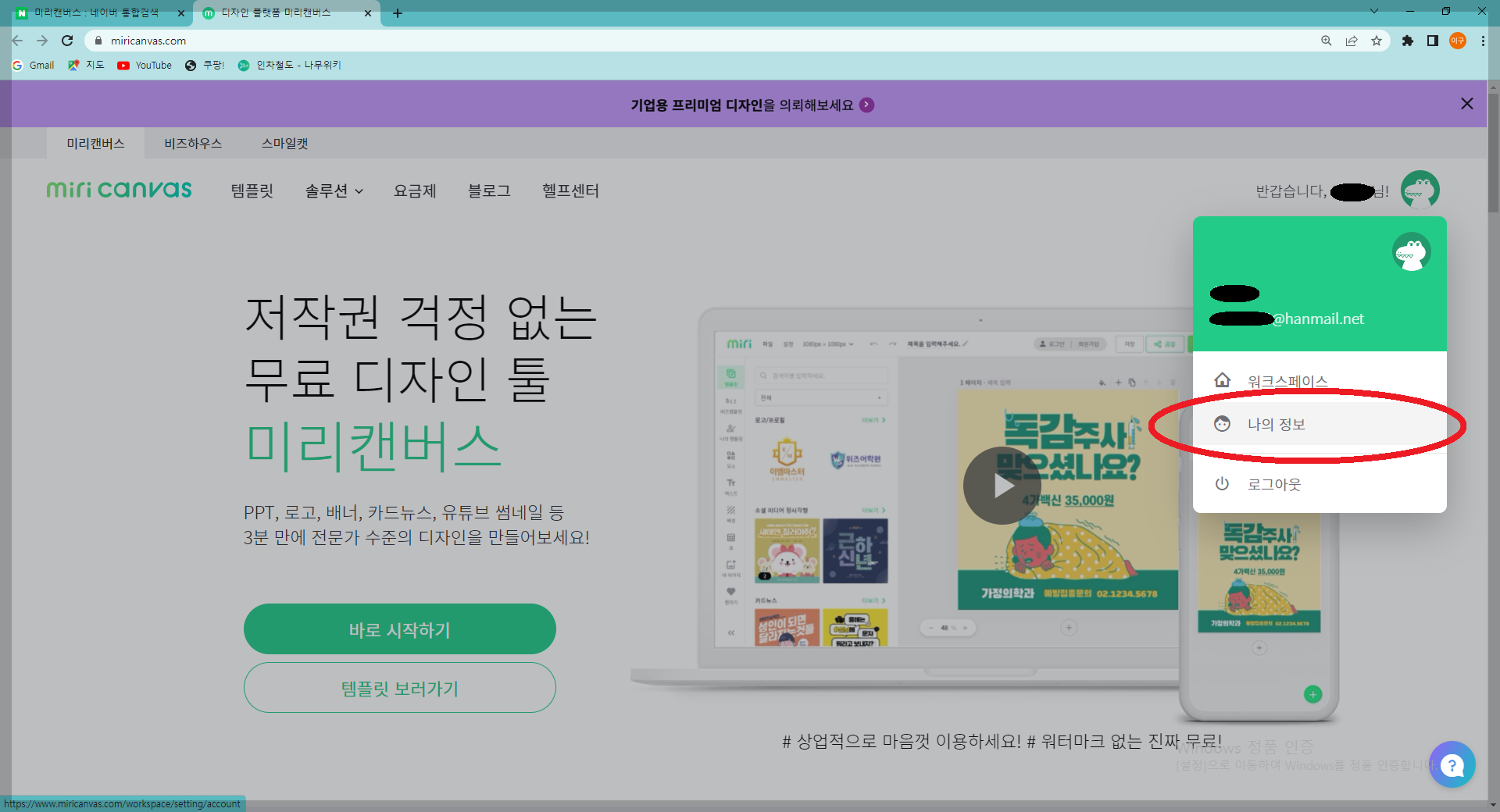 2. 우측 내계정을 눌러서 '나의정보' GO