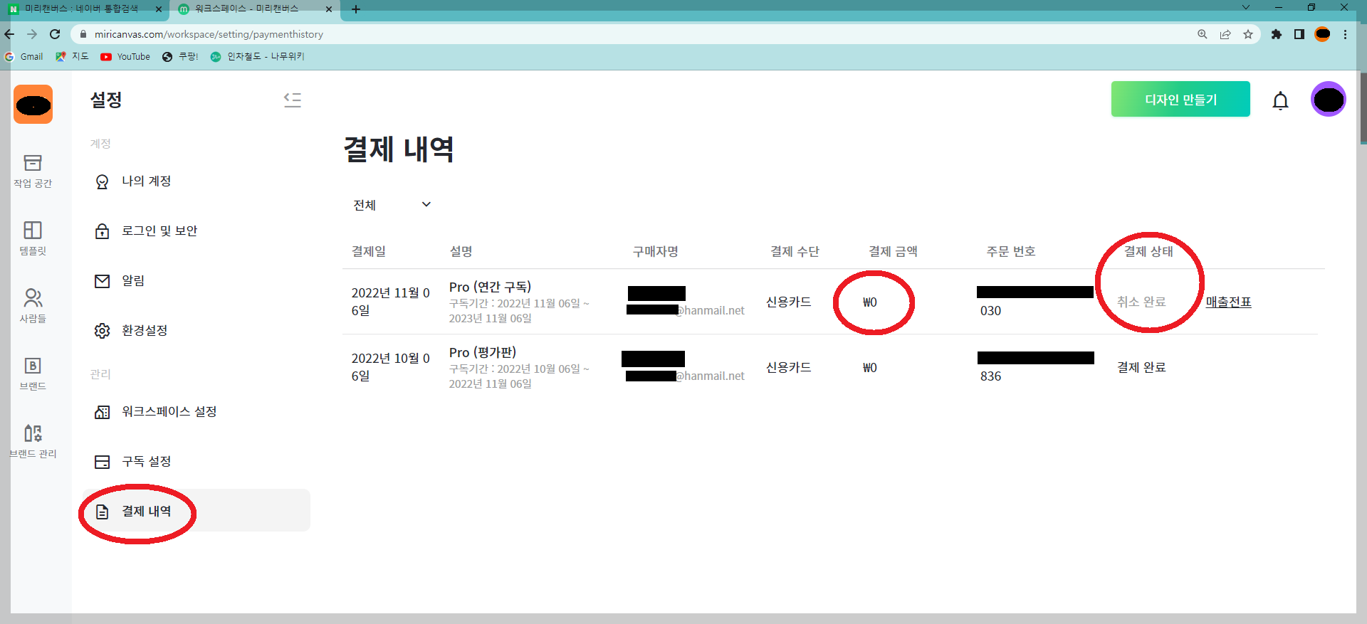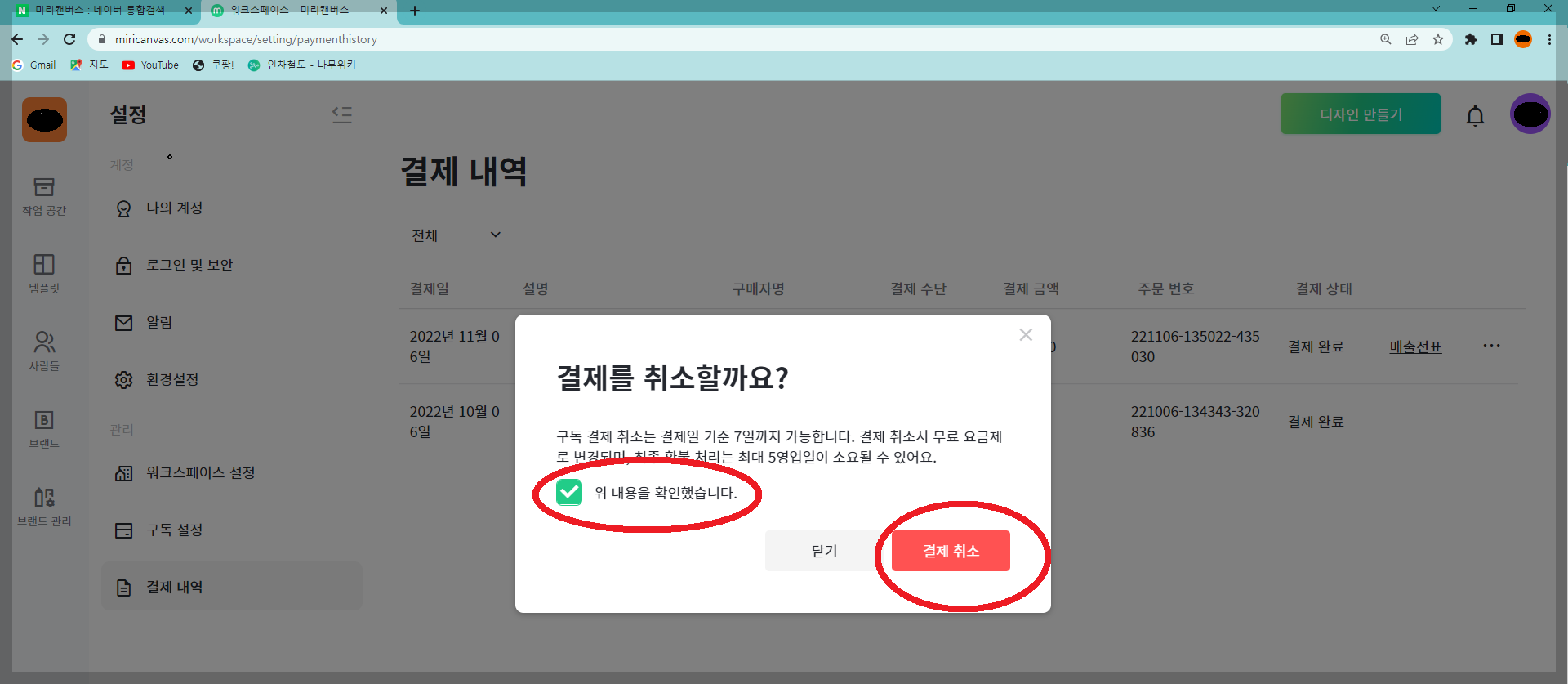 미리캔버스 160800원 결제취소 하는 법